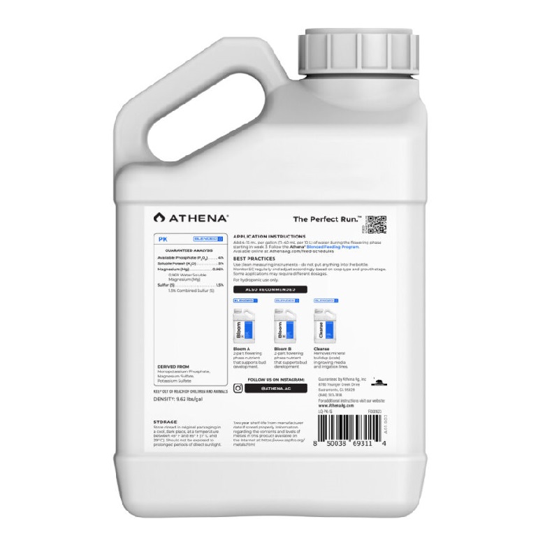 Το Athena PK είναι ένα ενισχυτικό ανθοφορίας (PK booster) ειδικά σχεδιασμένο για να αυξάνει την άνθιση και την παραγωγή των φυτών σας. Πρόκειται για ένα καθαρό, υγρό συμπλήρωμα χωρίς άζωτο, που ενισχύει τη δράση των λιπασμάτων Bloom και προσφέρει πρόσθετο φώσφορο (P) και κάλιο (K) – τα δύο βασικά στοιχεία που χρειάζονται τα φυτά κατά τη μέση έως και την όψιμη φάση ανθοφορίας για μέγιστη απόδοση και παραγωγή καρπών.